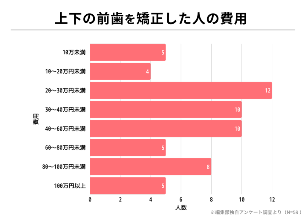 また、独自アンケートでも、費用が10万円未満だった方の多くが「前歯1〜2本のみ」を矯正したと回答しており、費用を最小限に抑えられるのはこの範囲に限られることが分かります。